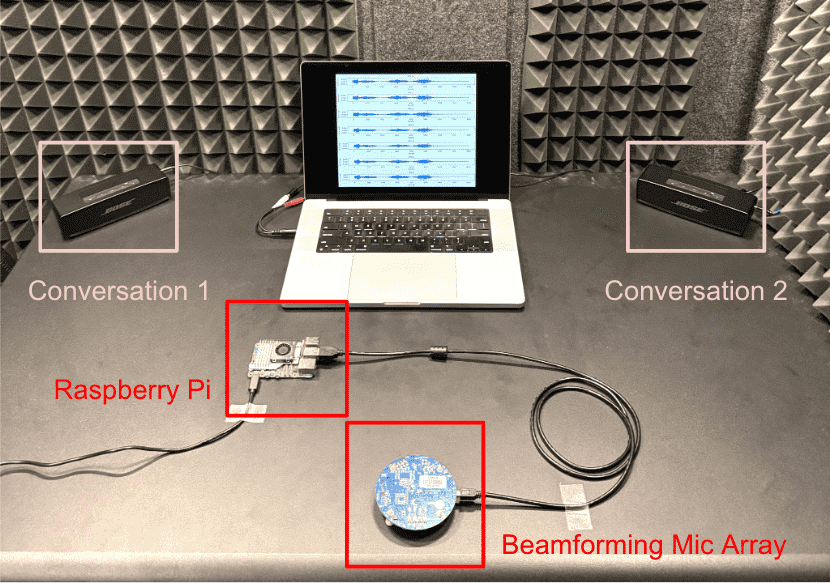图1展示了用于评估Beamforming-LLM系统的实验设置。一台笔记本电脑通过左右两个扬声器播放两个同时进行的对话,模拟空间上不同的讨论场景。一个波束成形麦克风阵列(miniDSP UMA-8)连接到Raspberry Pi,放置在听者位置,用于采集多通道音频,以实现空间分离和语义回忆。