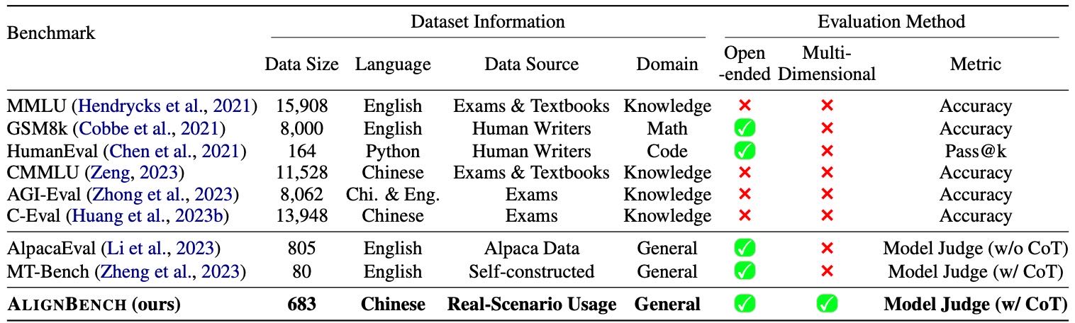 Table 1: Comparisons between ALIGNBENCH and other benchmarks, illustrating the features of ALIGNBENCH in terms of dataset information and evaluation methods.