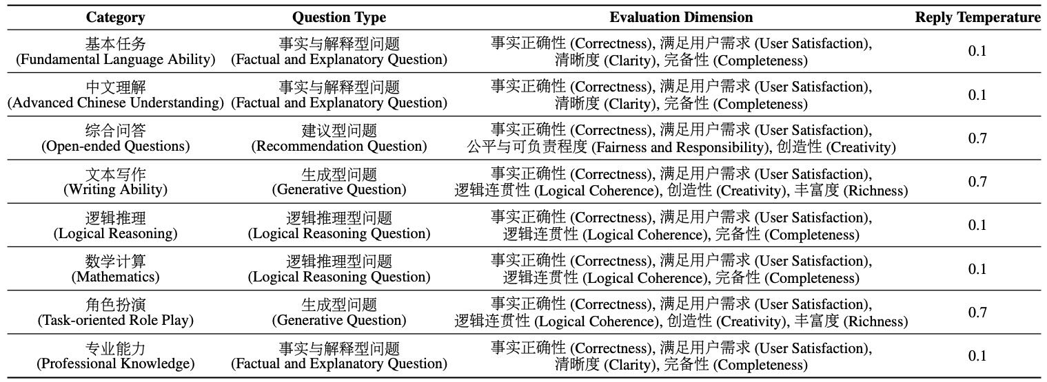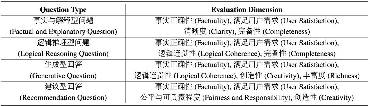 AlignBench 根据任务类型(如基本语言能力、中文理解、逻辑推理、数学计算等)设定了不同的评估维度(如事实正确性、用户满意度、逻辑连贯性、创造性等)。