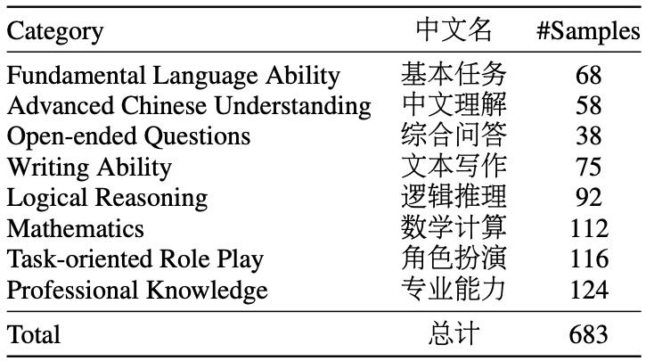 任务分类:测试集包含8个主要任务类别,覆盖中文LLMs的典型应用场景。