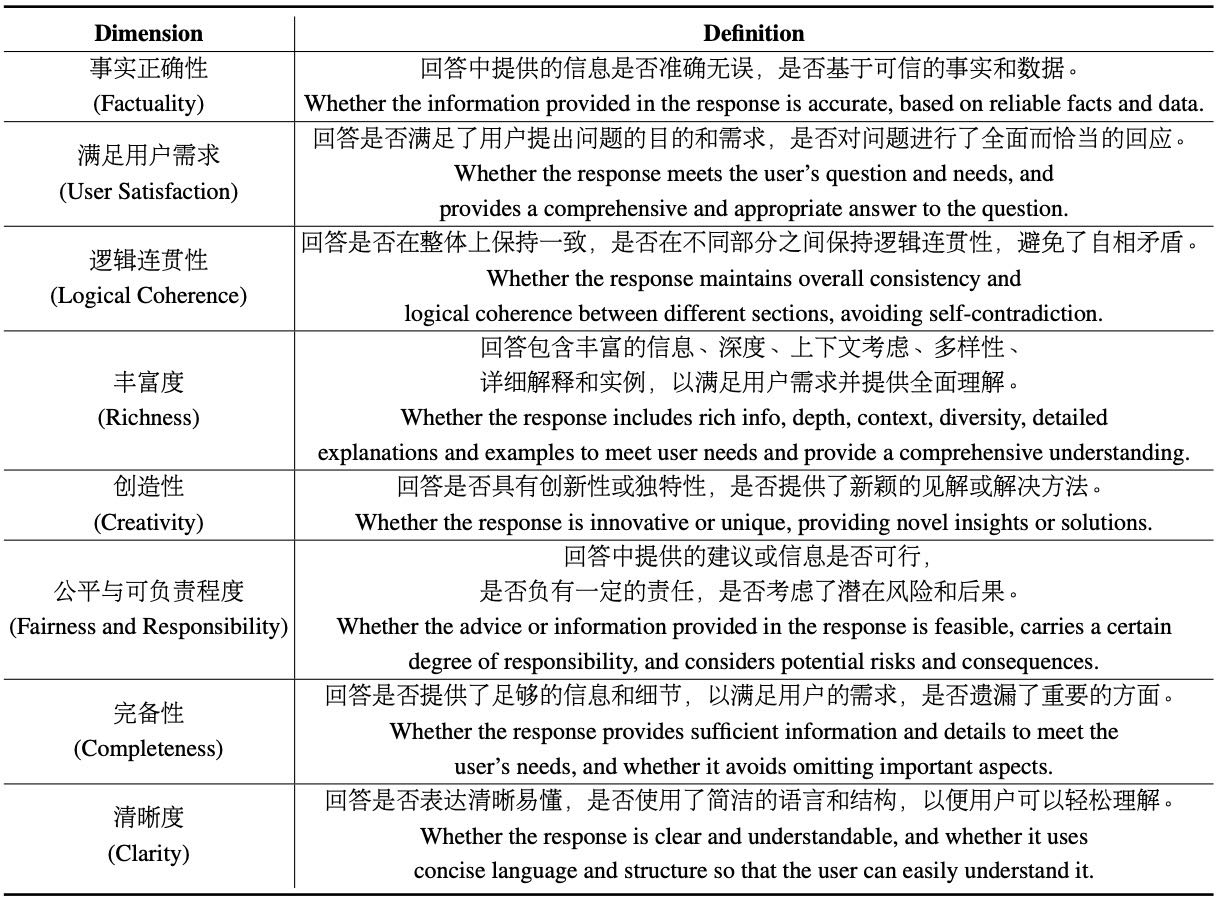 其中,事实正确性和满足用户需求这两个维度是最重要的,这两个维度的分数主导了最后的综合分数。