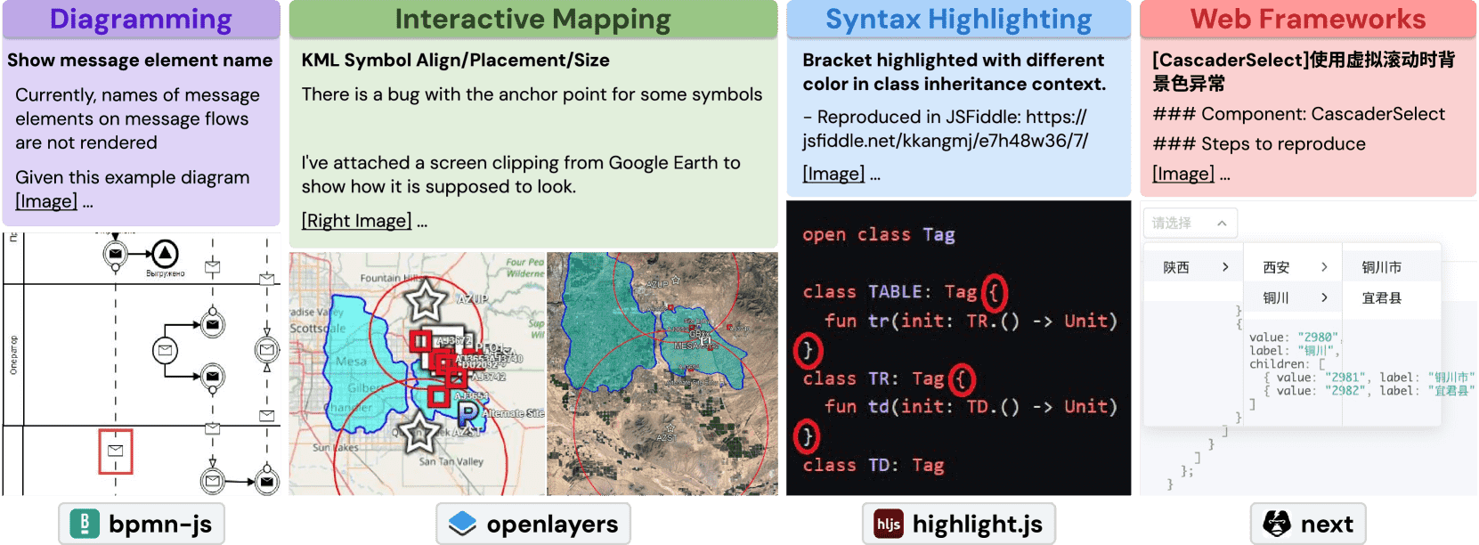 Figure 1: Four task instances from SWE-bench Multimodal.