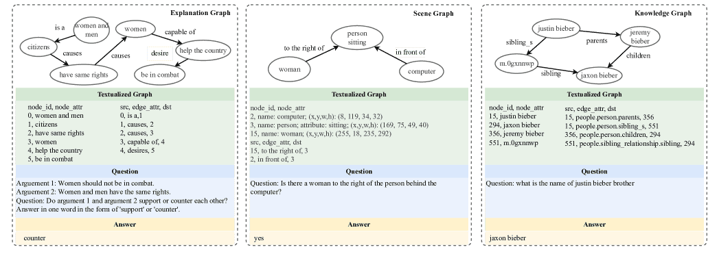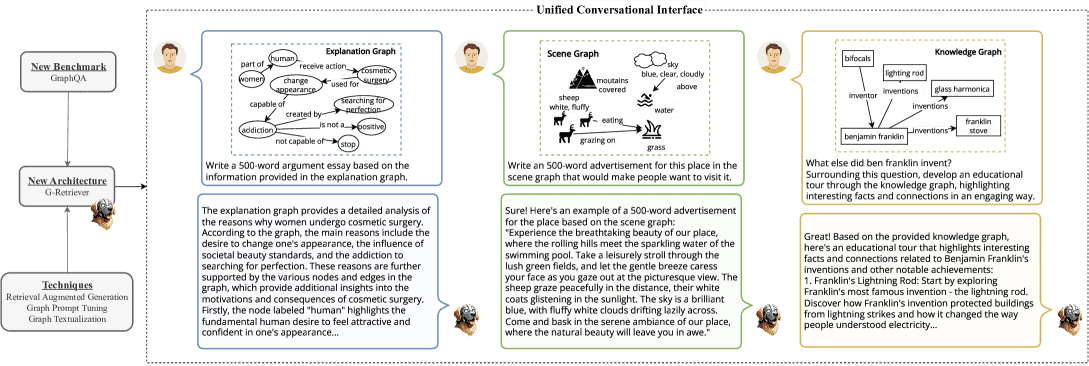 Figure 1:We develop a flexible question-answering framework targeting real-world textual graph applications via a unified conversational interface. Presented here are examples showcasing the model’s adeptness in handling generative and creative queries in practical graph-related tasks: common sense reasoning, scene understanding, and knowledge graph reasoning, respectively.