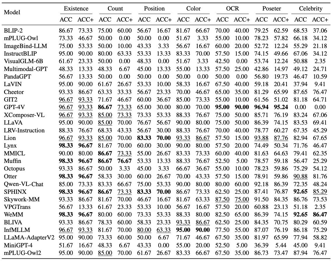Table 1. Evaluation results on the subtasks of existence, count, position, color, OCR, poster, and celebrity. The top two results on each subtask are bolded and underlined, respectively.