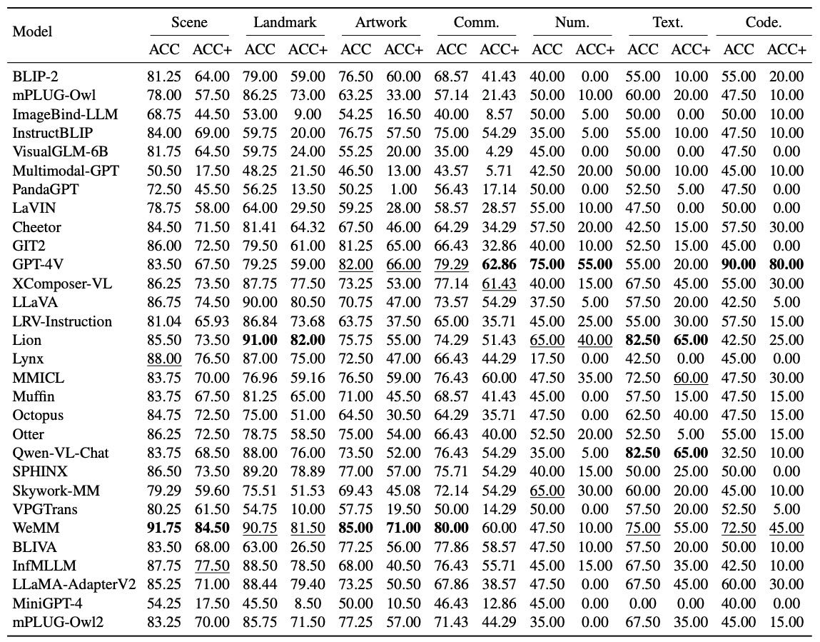 WeMM、Lion、InfMLLM 等模型在多个任务中表现出色;