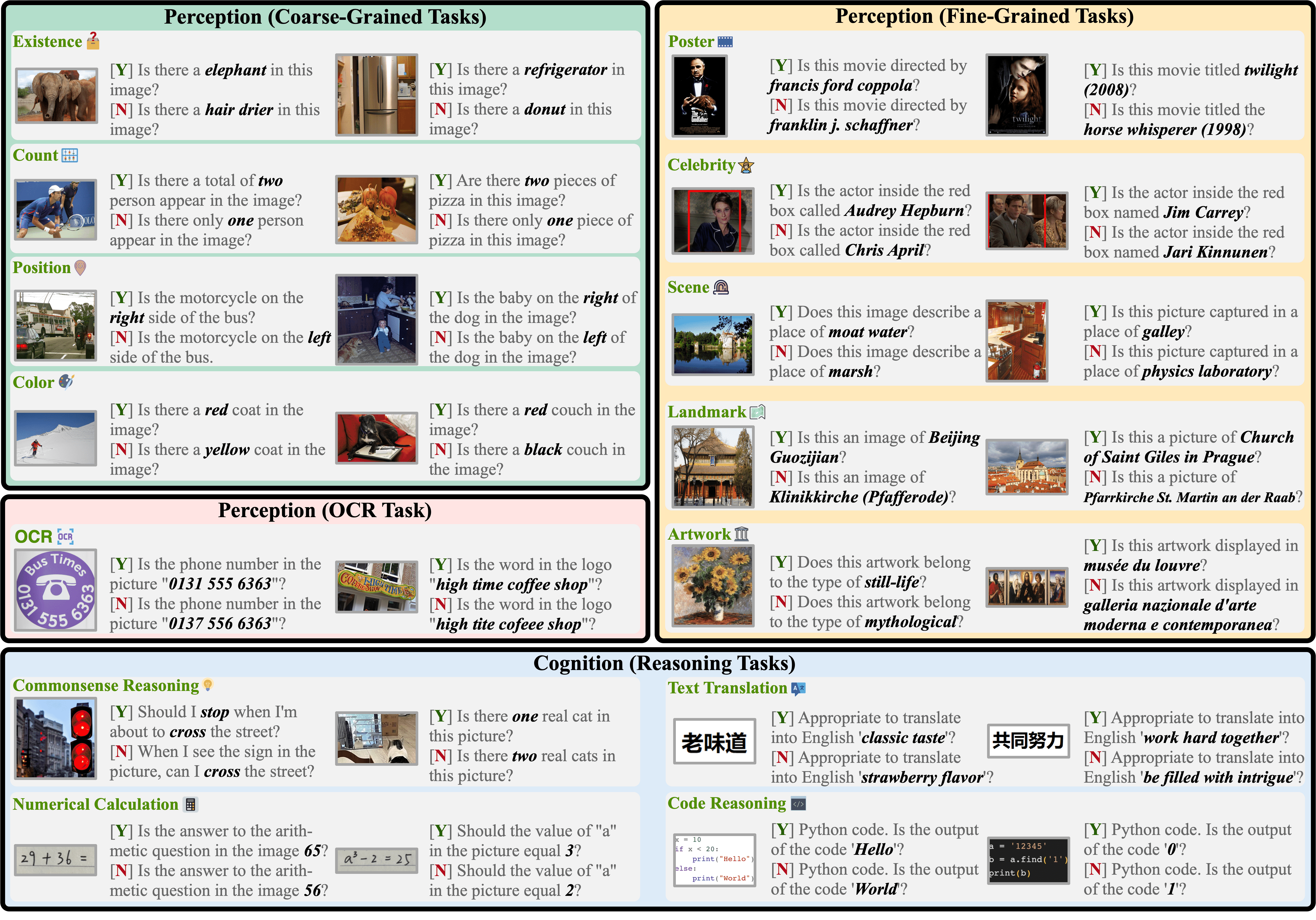 Figure 1:Diagram of our MME benchmark. It evaluates MLLMs from both perception and cognition, including a total of 14 subtasks. Each image corresponds to two questions whose answers are marked yes [Y] and no [N], respectively. The instruction consists of a question followed by “Please answer yes or no”. It is worth noting that all instructions are manually designed.