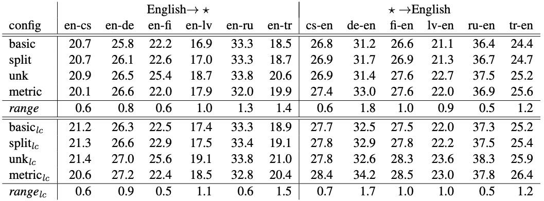 作者发现,不同常用配置下BLEU得分差异最高可达1.8。