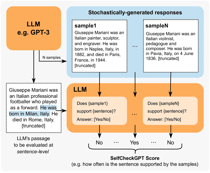 Figure 1:SelfCheckGPT with Prompt. Each LLM-generated sentence is compared against stochastically generated responses with no external database. A comparison method can be, for example, through LLM prompting as shown above.