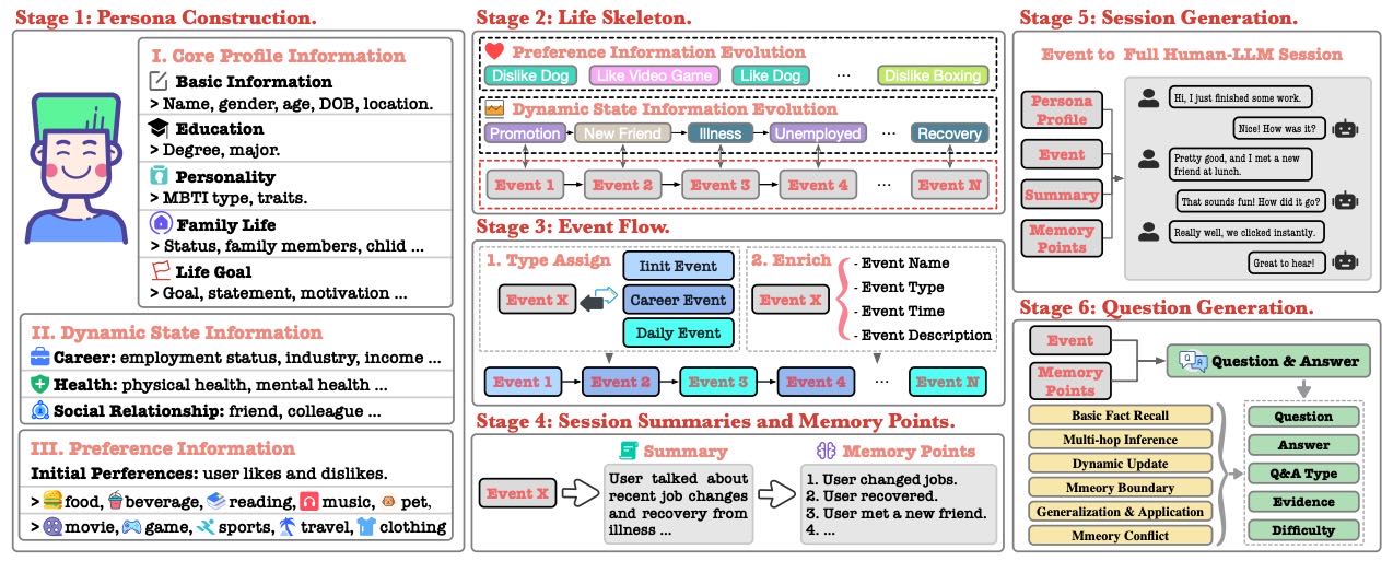 阶段 4–6:生成记忆点、对话轮次、问答对,用于评估模型记忆与推理能力。
