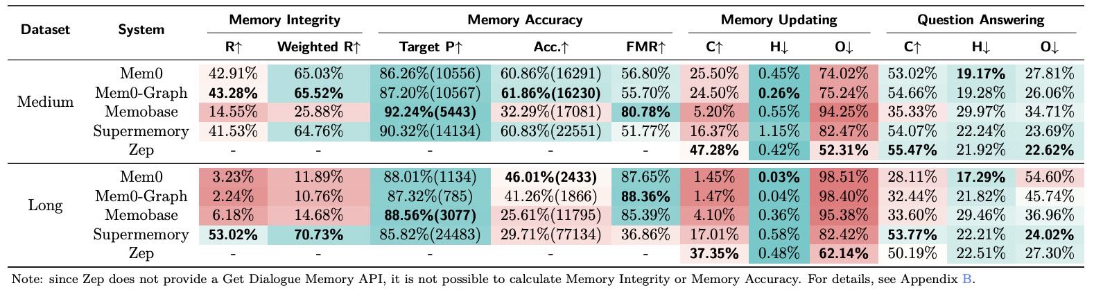 构建了包含三类任务的评估框架:记忆提取、记忆更新、基于记忆的问答。