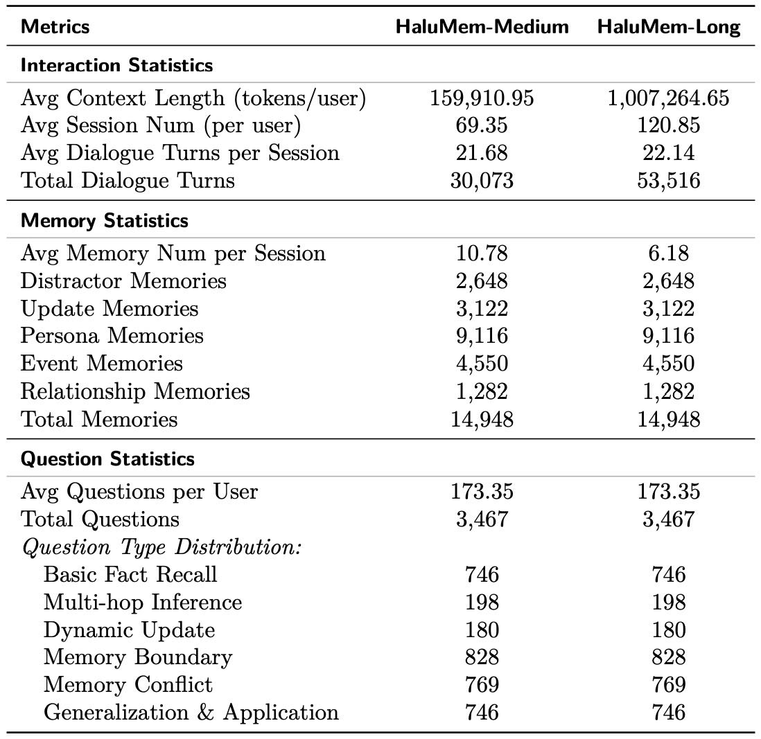 每个数据集包含约15,000个记忆点和3,500个多类型问题。每个用户的平均对话轮数分别为1,500和2,600轮,上下文总token数超过1百万,支持在不同上下文长度和任务复杂度下评估幻觉现象。