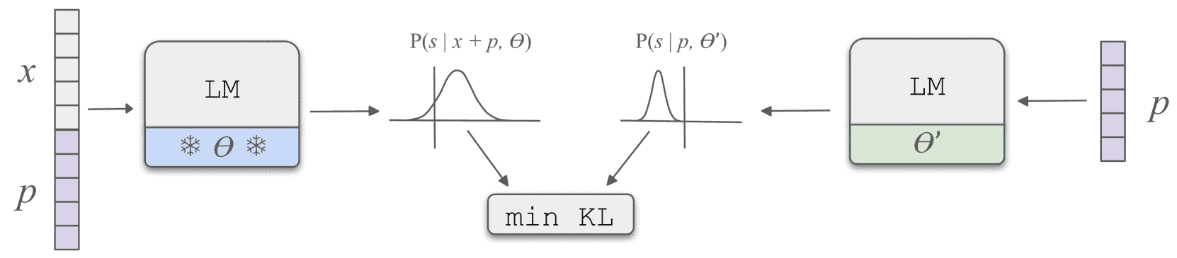 令 \( P(s|x+p, \theta) \) 表示模型 \( \theta \) 在输入 \( x + p \) 时对句子 \( s \) 的概率分布,而 \( P(s|p, \theta') \) 是模型 \( \theta' \) 在输入 \( p \) 时的输出分布。我们希望通过最小化两者的 KL散度,使 \( \theta' \) 能够准确地模拟 \( \theta \) 在上下文 \( x \) 下的行为。