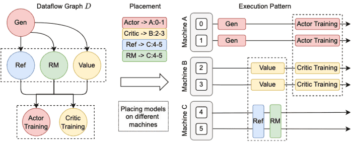 Model Placement: 模型放置 (Model Placement) 指的是在分布式系统中,如何将 RLHF 数据流图中的不同模型(如 actor, critic, reward model 等)分配到具体的计算设备(如 GPU)上。这包括决定哪些模型可以被放置在同一组 GPU 上(共址/colocation),哪些模型需要放置在不同的 GPU 集上,以及为每个模型分配多少 GPU 资源。优化的模型放置策略对于最大化 RLHF 整体吞吐量、避免资源争用和减少通信开销至关重要。
