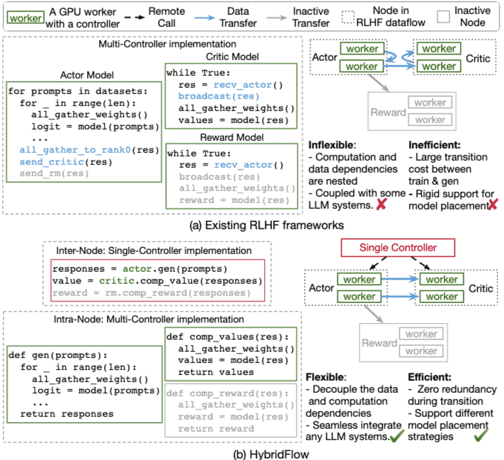 HybridFlow是一个灵活高效的RLHF(Reinforcement Learning from Human Feedback)框架,旨在解决大型语言模型(LLM)对齐中RLHF数据流的复杂性和效率挑战。传统的RL框架采用单控制器范式,在RLHF中效率低下,因为每个节点都是一个分布式LLM程序,导致控制分派开销巨大。现有RLHF系统采用多控制器范式,虽然分派开销小,但因计算与数据通信深度耦合而缺乏灵活性。HybridFlow创新性地结合了这两种范式,在跨节点层面采用单控制器,在节点内部(即模型内部)采用多控制器,从而实现灵活表示和高效执行RLHF数据流。