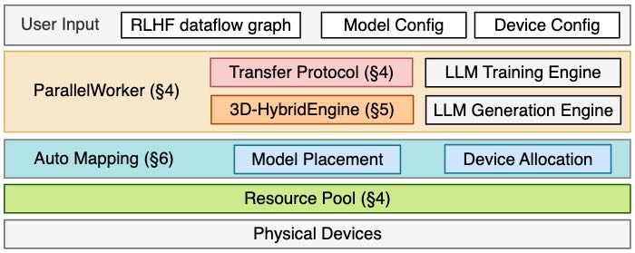 HybridFlow: HybridFlow 是本文提出的一个灵活且高效的 RLHF 框架。它结合了单控制器和多控制器的范式,旨在解决传统 RLHF 系统在表达 RLHF 数据流的灵活性和执行效率方面的不足。HybridFlow 通过设计一套分层 API 来解耦计算和数据依赖,从而能够高效地编排 RLHF 算法,并将计算灵活地映射到各种设备上。其核心组件包括混合编程模型、3D-HybridEngine 和自动映射算法。
