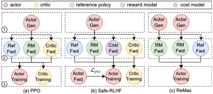 Figure 1. Dataflow graph of 3 RLHF algorithms. Stage 1, 2, 3 represent Generation, Preparation, andTraining, respectively.