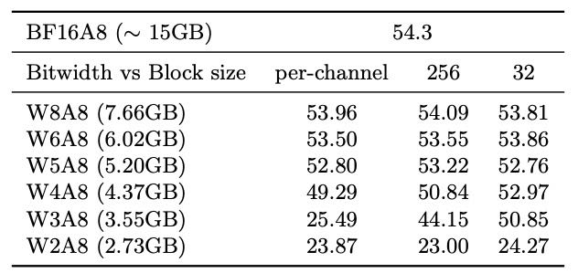 用较大的量化块(block size = 256)会影响性能,小块(如32)更好。