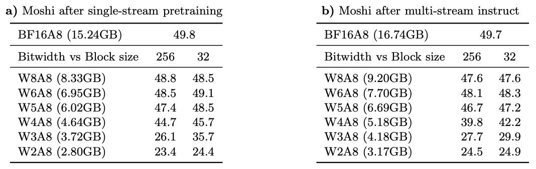 Helium 模型(Moshi 的文本基础模型) 较为耐量化,4bit 后性能只下降不到2分,模型变小3.4倍。