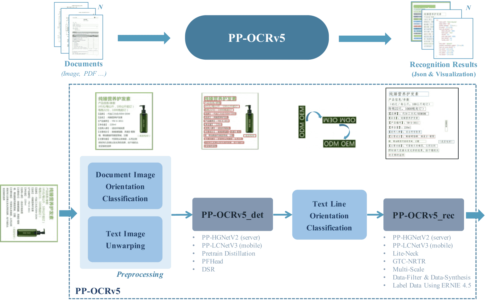 预处理:包括图像方向分类和展开模型,与 PP-OCRv5 的预处理部分相同。