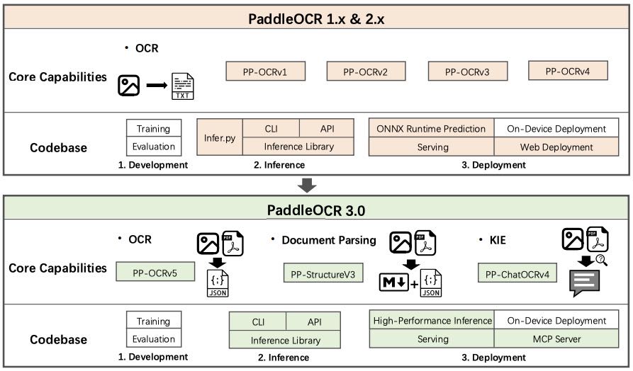 Figure 2: Evolution from PaddleOCR 1.x & 2.x to PaddleOCR 3.0. Different colors have been employed to denote areas with notable discrepancies between PaddleOCR 1.x & 2.x and PaddleOCR 3.0.