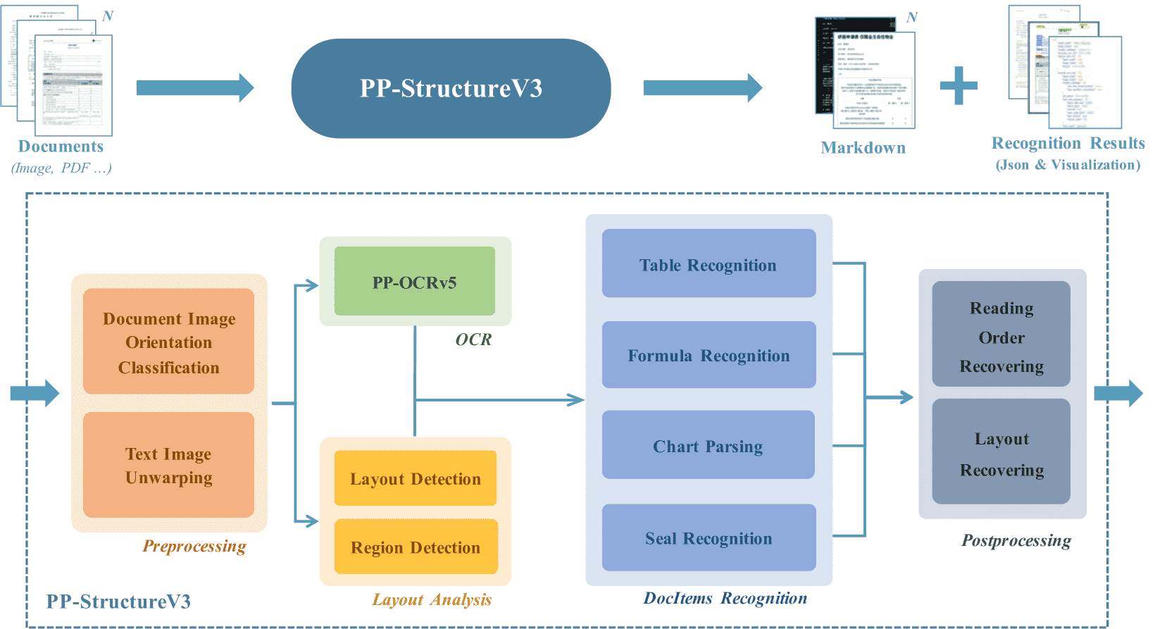 PP-Structure:作为文档解析模块,识别布局、文本和表格等结构。