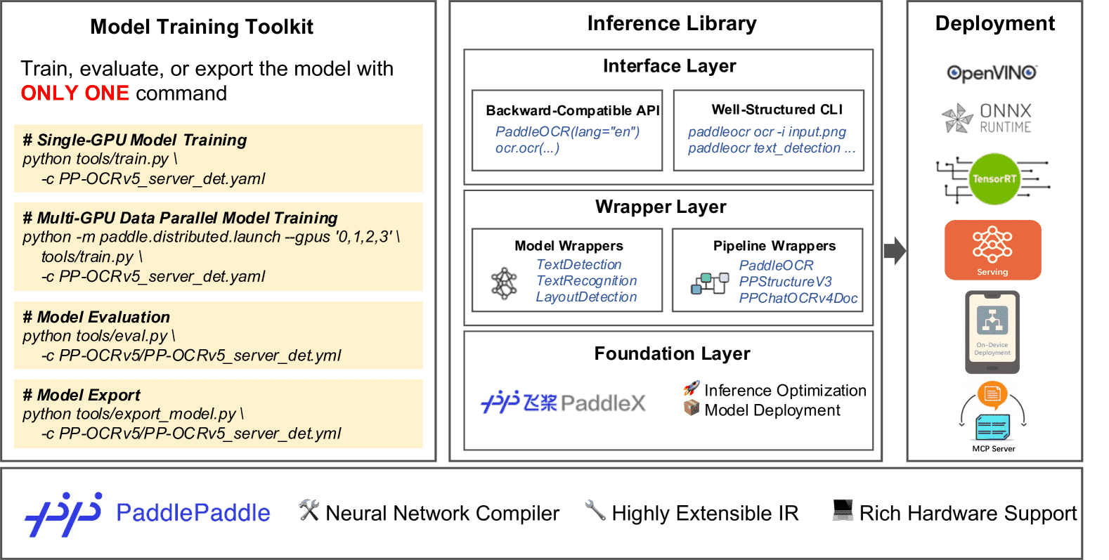 作为开源 OCR 项目,PaddleOCR 从 2020 年起持续推动 OCR 技术的发展。其核心特点是全面覆盖、端到端流程和轻量高效。PP-OCR 系列不断迭代,从 v1 到 v4 不断提升识别性能、扩展语言支持,并引入文档结构理解能力(如 SLANet 表格识别)。