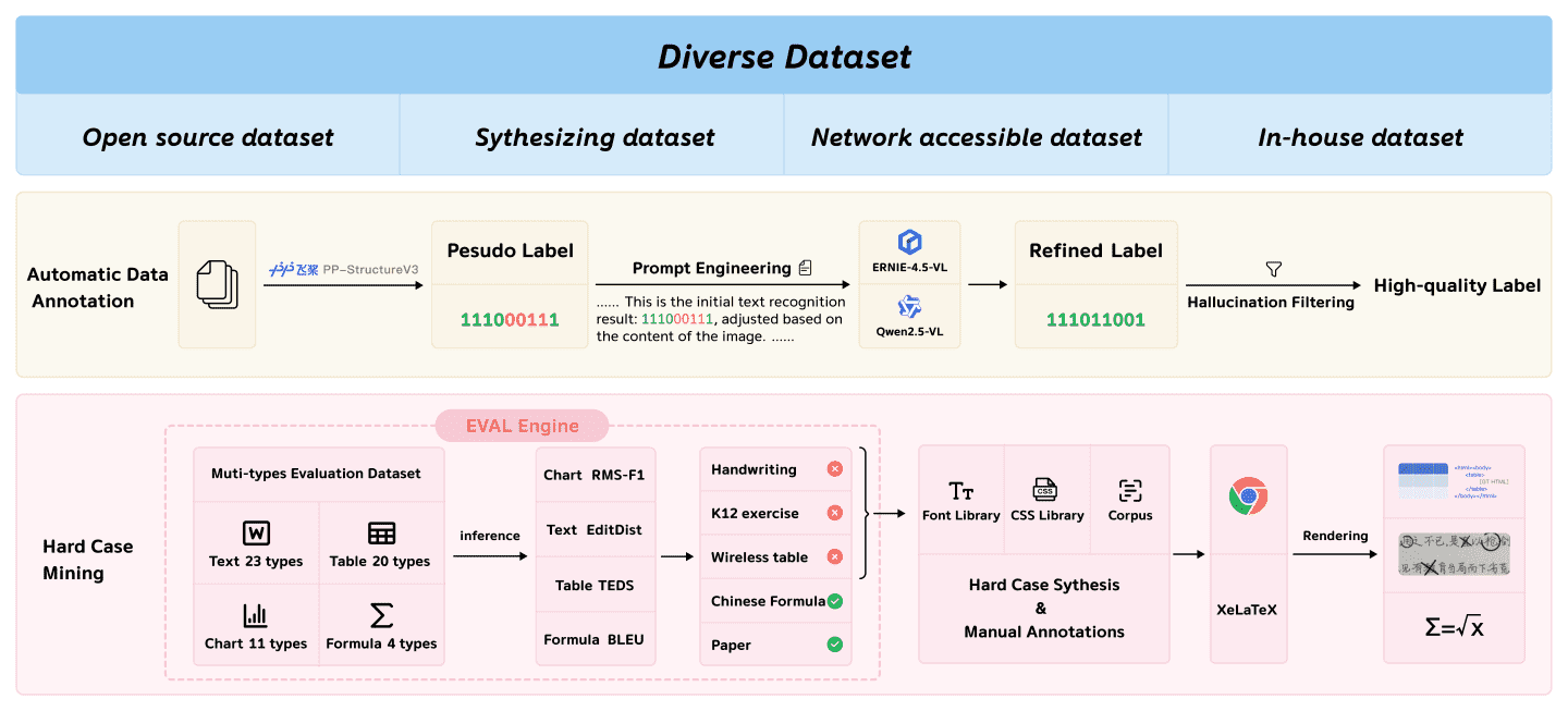 提出一种专为资源高效推理设计的视觉-语言模型,结合 NaViT 风格的动态高分辨率视觉编码器与轻量级语言模型 ERNIE-4.5-0.3B,显著提升了模型在元素识别与解码效率方面的表现。该架构在保持高精度的同时降低了计算需求,非常适合实际文档处理应用。高质量数据构建方法论(High-quality Data Construction Methodology):