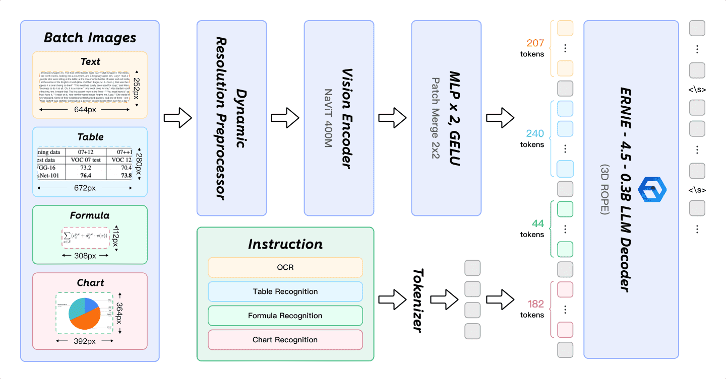 其次,根据位置信息对元素进行分割,并输入 PaddleOCR-VL-0.9B 进行识别。该视觉-语言模型专为资源高效推理设计,在文档解析中的元素识别任务中表现出色。其结合了 NaViT 风格的动态高分辨率视觉编码器与轻量级 ERNIE-4.5-0.3B 语言模型,显著提升了识别能力和解码效率。