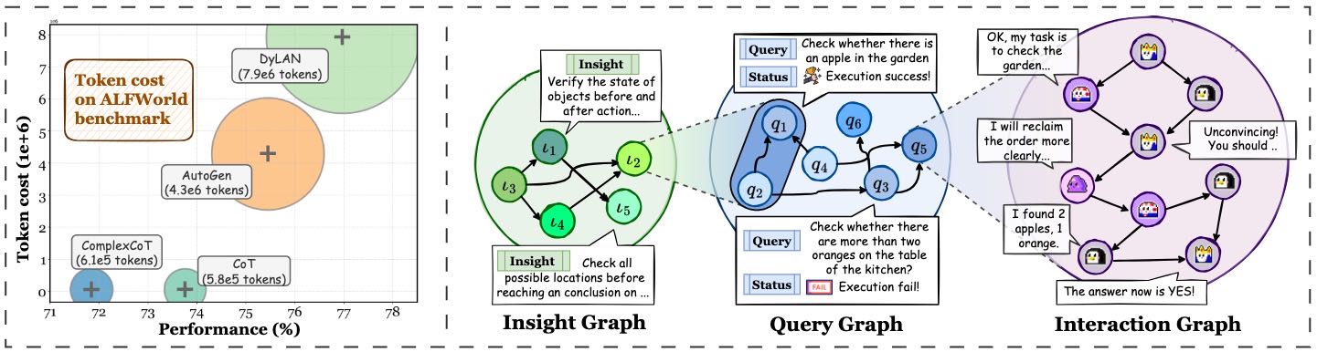 Figure 1: (Left) We report the token cost of several single-agent and MAS baselines on ALFWorld benchmark; (Right) The overview of G-Memory’s three-tier hierarchical memory architecture, en-compassing the insight graph, query graph and interaction (utterance) graph.