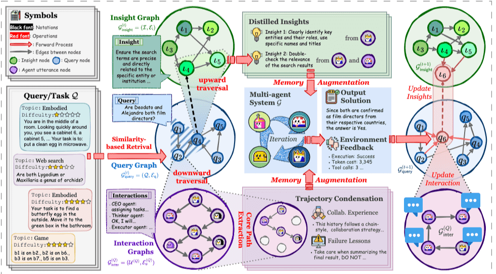🧠 本文提出了G-Memory,一个受组织记忆理论启发的分层式智能体记忆系统,通过洞察图、查询图和交互图三层图结构管理MAS的冗长交互历史。