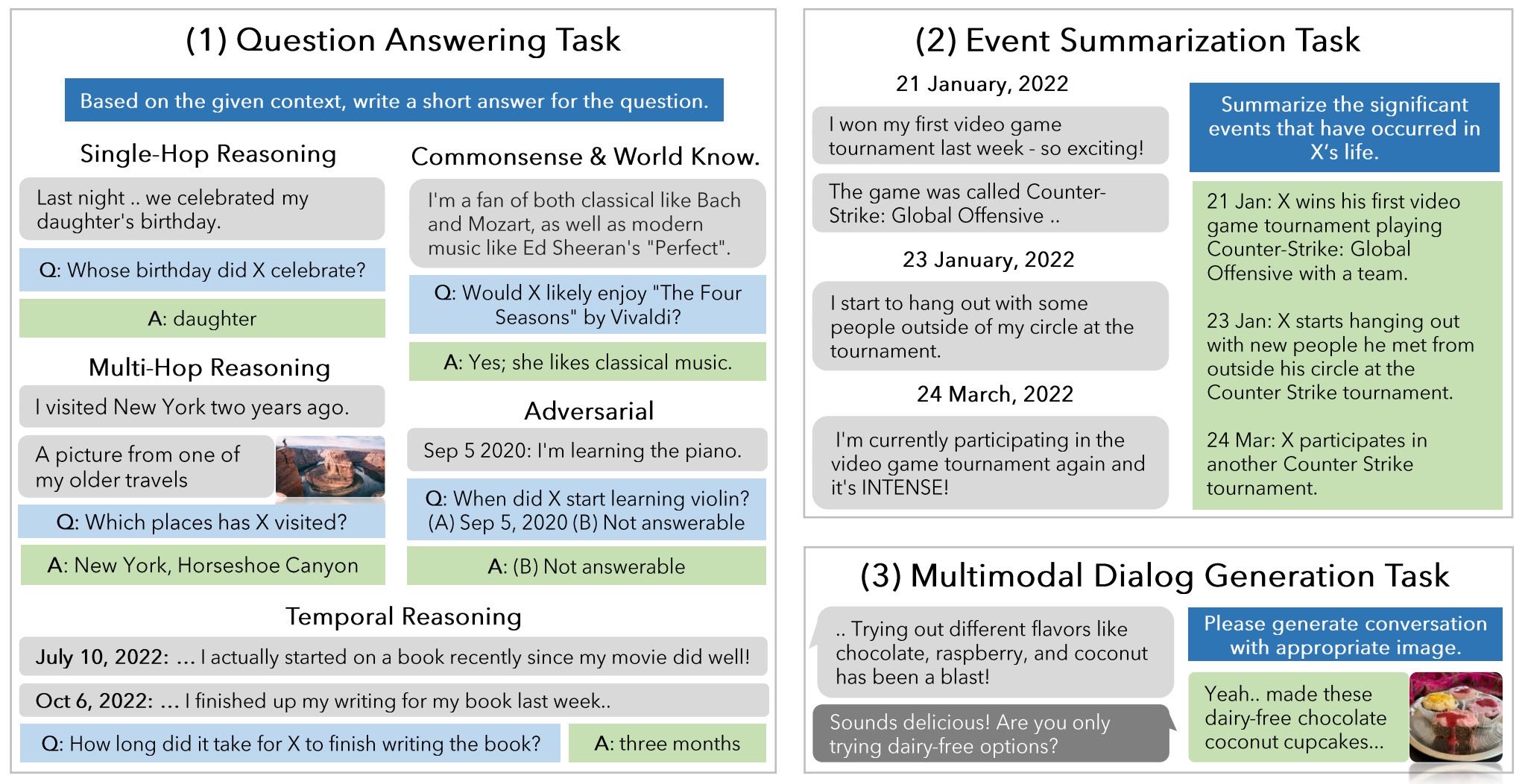 Figure 2: Overview of our evaluation framework. We propose three tasks: question answering, event summarization and multimodal dialog generation to evaluate models’ comprehension in very long-term dialogues.