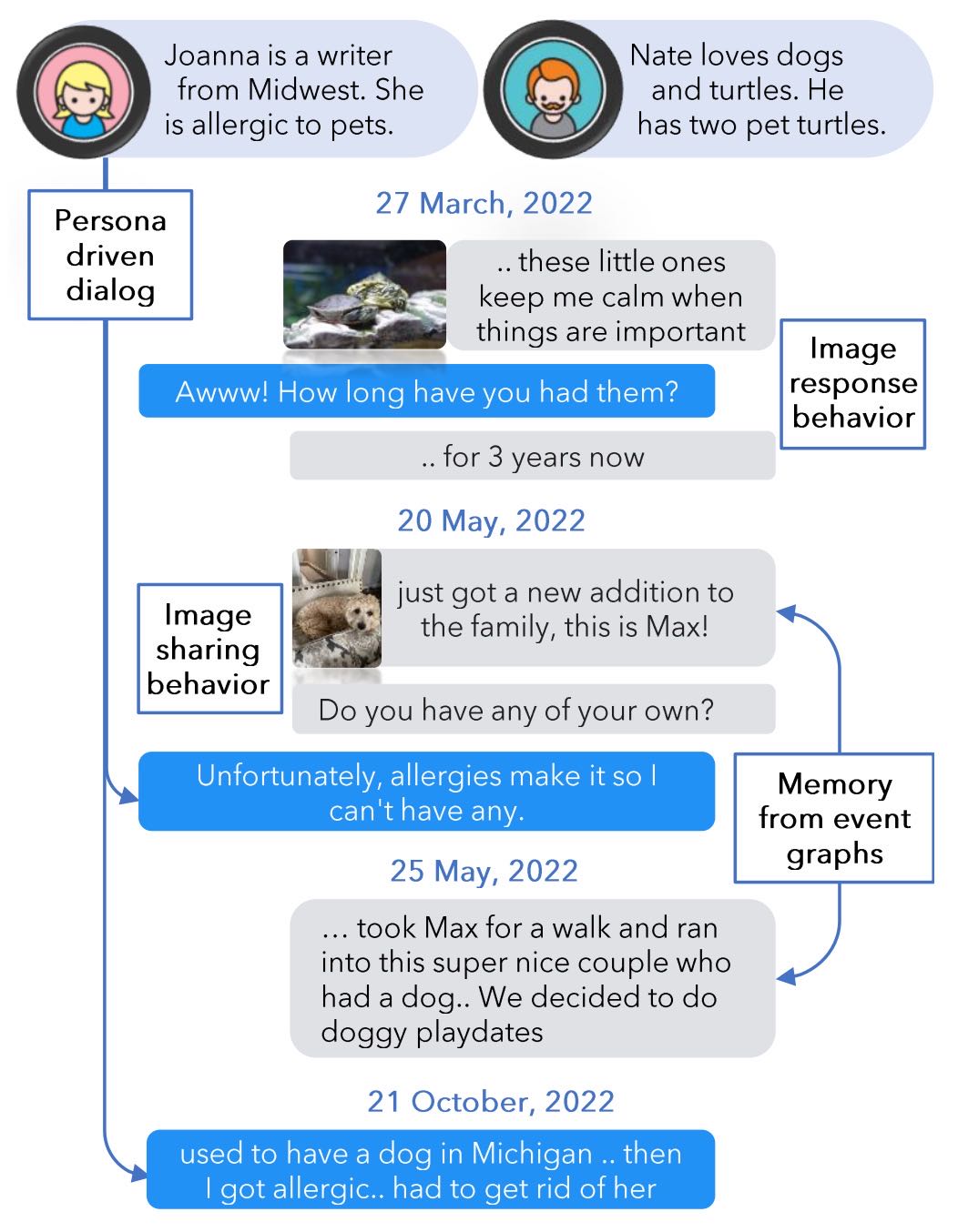 虚拟代理的构建:为两个代理(ℒ₁ 和 ℒ₂)分配独特的角色(persona)和时间事件图(temporal event graph),并赋予记忆与反思模块,以支持长期对话记忆和多模态交互(如图像分享与反应)。