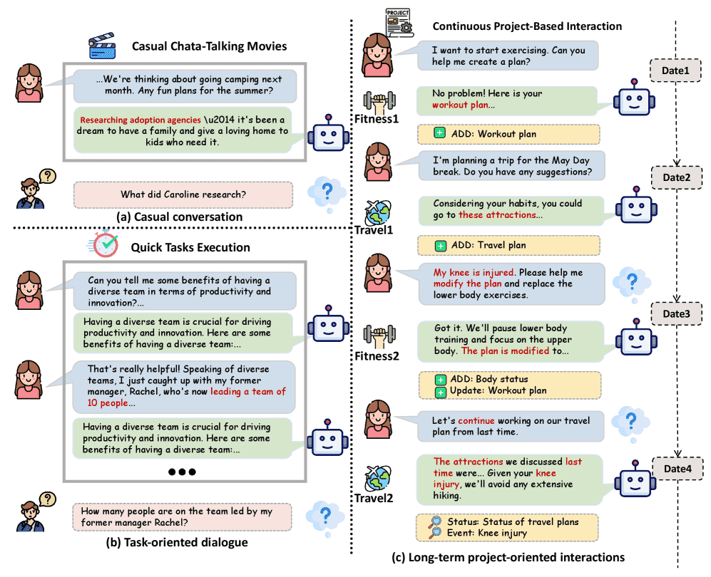 通俗解释: 想象你雇佣了一位真人私人助理。闲聊是“今天天气不错”;任务导向是“帮我订一张票”;而项目导向是“帮我策划一场为期半年的环球旅行”。在这个过程中,你的预算、时间表、喜好会变,助理必须记住三个月前你说过不喜欢早起,并且要把这些碎片信息串联起来,这就是RealMem要测试的能力。