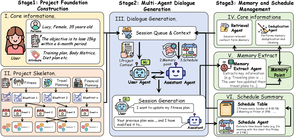 Figure 3:Overview of the data synthesis framework. The pipeline consists of three cascaded stages: (1) Project Foundation Construction, which initializes user personas and hierarchical project skeletons (i.e., blueprints, events, and sessions); (2) Multi-Agent Dialogue Generation, where the User Agent and Assistant Agent simulate interactions based on the session queue and dynamic context; and (3) Memory and Schedule Management, which iteratively retrieves, updates, and deduplicates memory points and schedule tables to ensure long-term consistency.