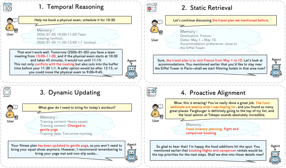 通俗解释: 就像玩游戏存档。如果你周一决定练剑术,周三又改主意要练魔法,AI的记忆系统必须覆盖旧档(练剑),更新为新档(练魔法),并且在周五你问“我该买什么装备”时,基于新档(魔法)给出建议,而不是基于旧档。RealMem特别强调这种“修改和覆盖”的能力。