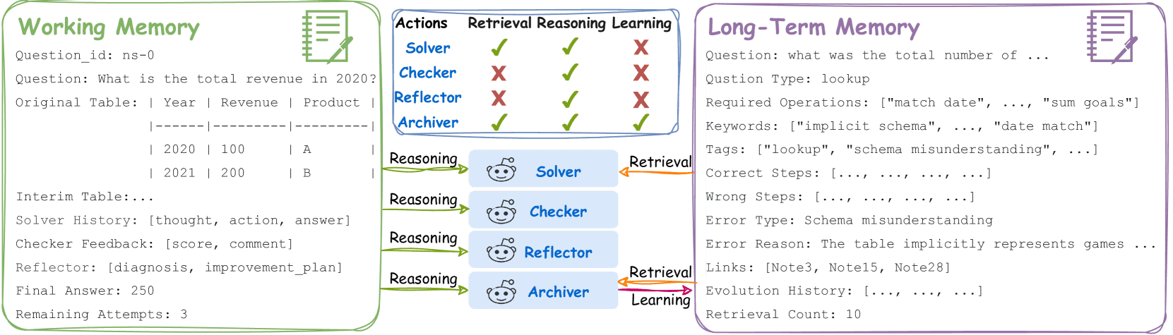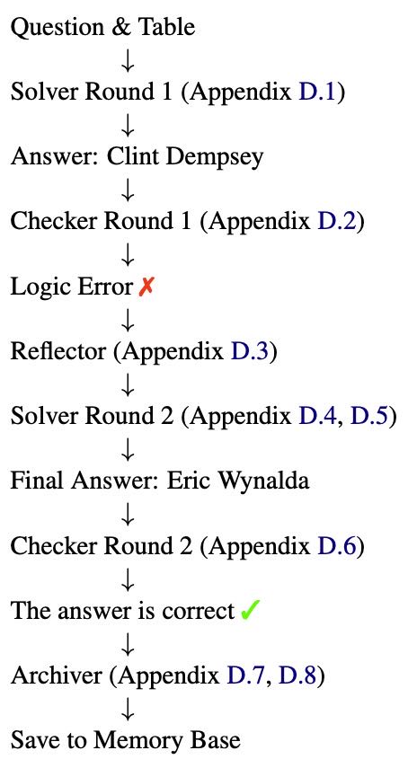 Solver(求解器):执行逐步推理,通过与表格的实时互动进行动态操作。其输入包括当前环境、问题、历史操作和记忆;输出为中间操作结果或最终答案。