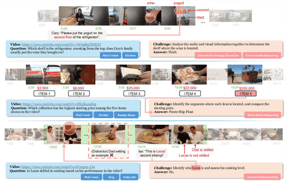 研究者对这些视频进行了问答对标注,用于测试智能体在人类理解、通用知识提取和跨模态推理等关键能力上的表现。