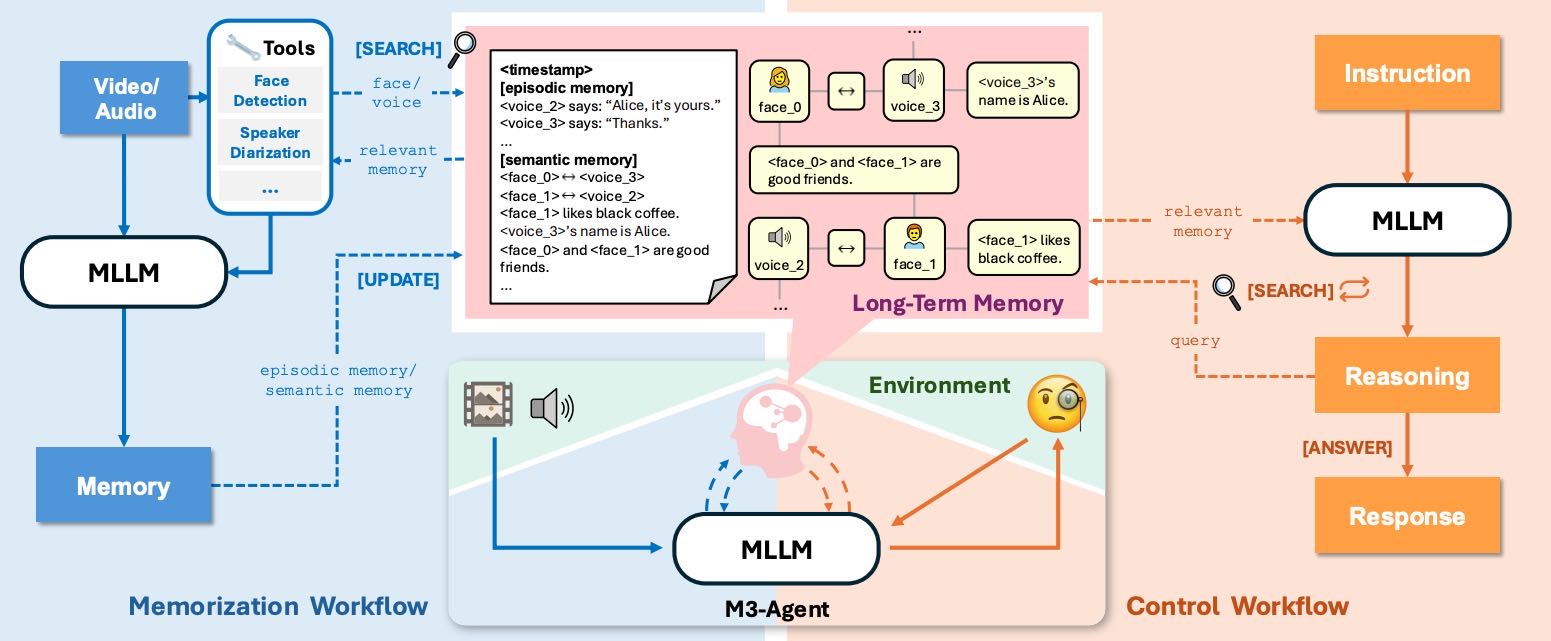 本文提出了一种新颖的多模态智能体框架 M3-Agent,具备长期记忆能力。M3-Agent 能够像人类一样处理实时视觉和听觉输入,并据此构建和更新长期记忆。除了情景记忆(episodic memory),它还具备语义记忆(semantic memory),能够随时间积累世界知识。其记忆以以实体为中心、多模态格式组织,有助于对环境进行更深入、一致的理解。