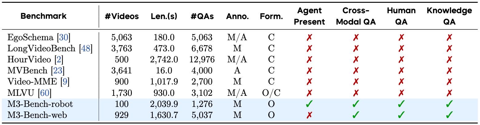 M3-Bench 是首个用于评估记忆与推理能力的长视频问答基准;