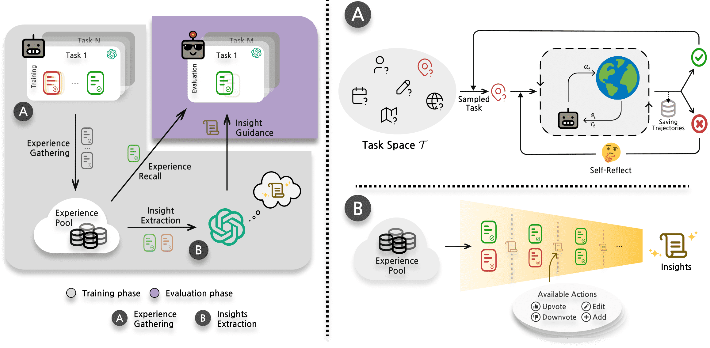 (B) 见解提取过程:根据成功/失败经验对现有见解列表进行动态更新,支持 ADD、UPVOTE、DOWNVOTE 和 EDIT 操作,重点在于提取常见失败模式或最佳实践。