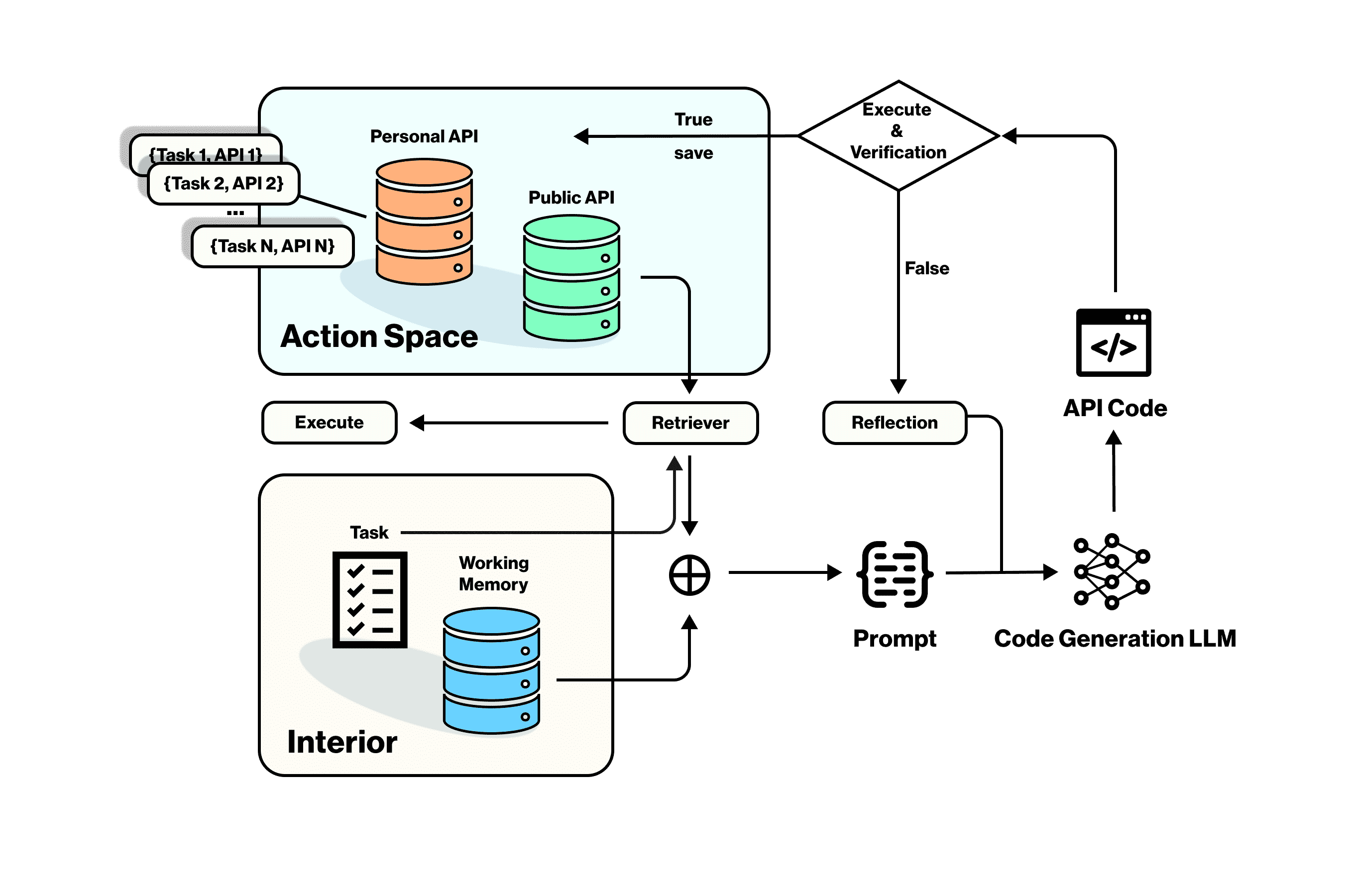 重点讲解: 整个系统将任务或子任务与工作记忆结合,通过检索器在个人API库和公共API库中查找对应动作。若动作已存在,则直接执行;若不存在,系统则会结合整个动作空间和内部信息,使用微调后的语言模型(LLM)生成结构化代码。生成的代码在验证成功后,将作为新的(任务,API)对存入个人API库供后续使用。若验证失败,则会触发反思模块,生成新的代码块(Shinn et al., 2023)。