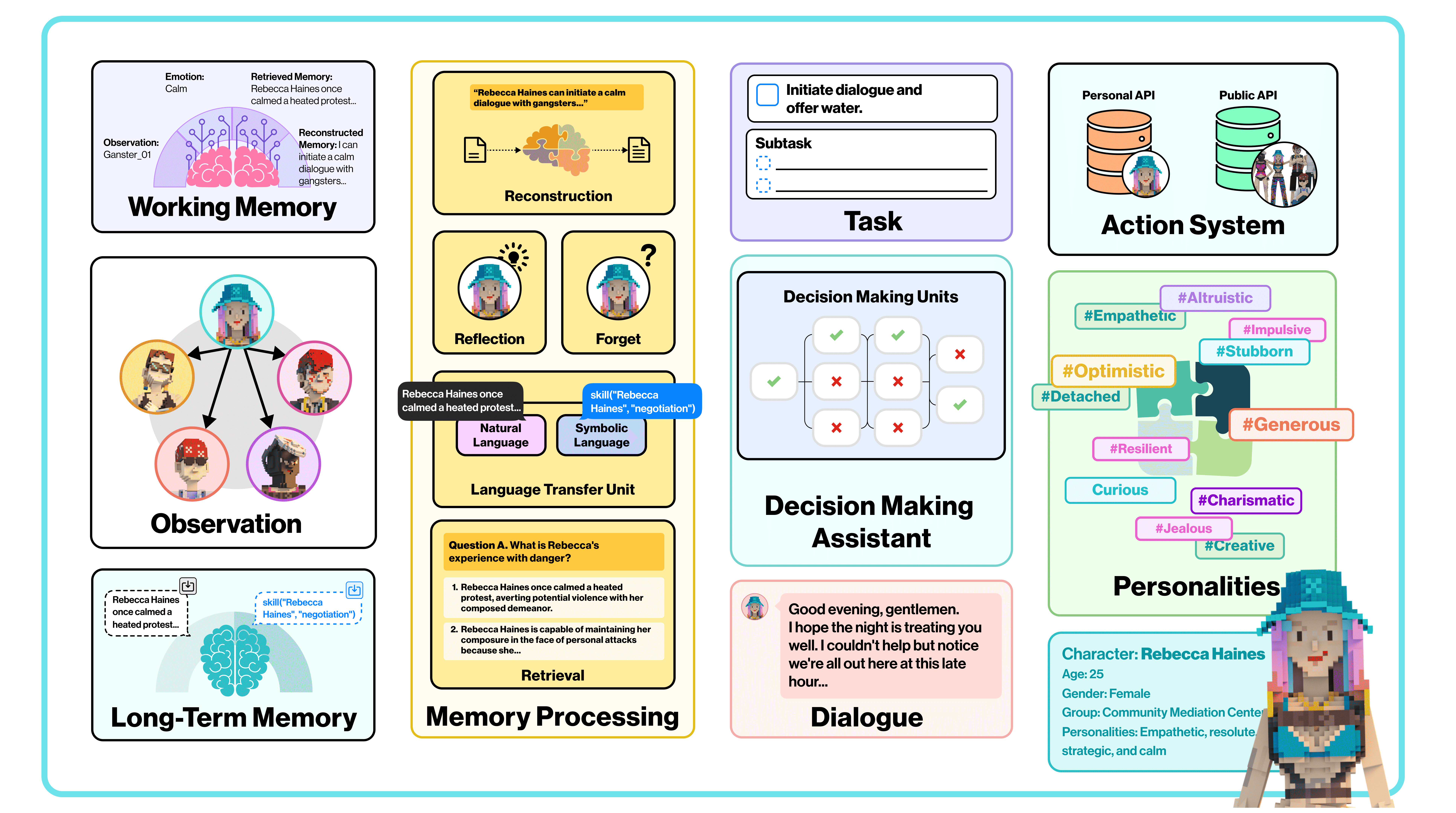 认知架构:包括记忆处理和决策辅助系统,这是框架的核心部分,强调代理需要具备长期记忆和灵活决策的能力,以适应复杂的环境。