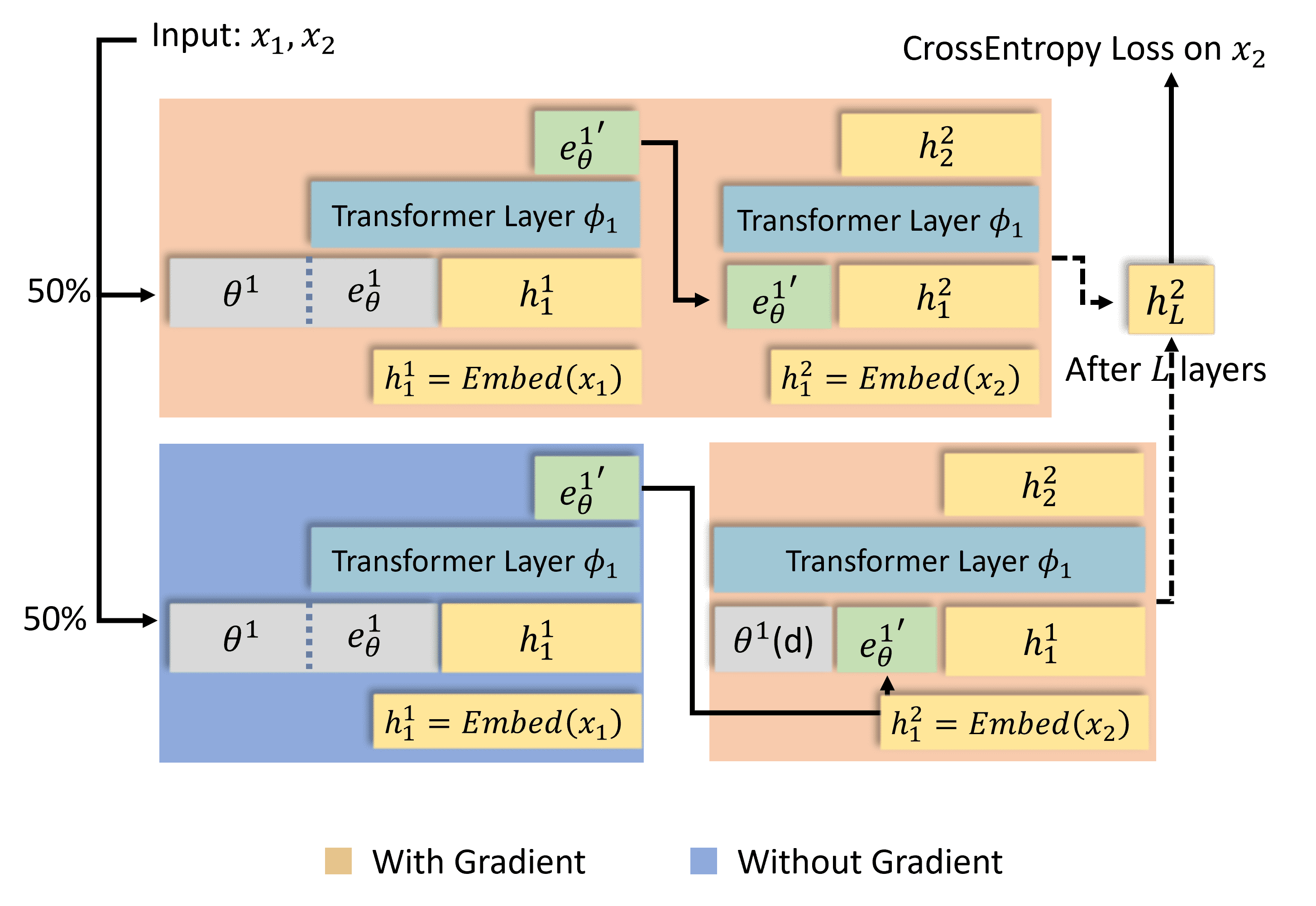 若严格按上述流程,需在内存中同时保存x₁和x₂的完整计算图(尤其是长序列),显存占用会极高。传统方法限制: