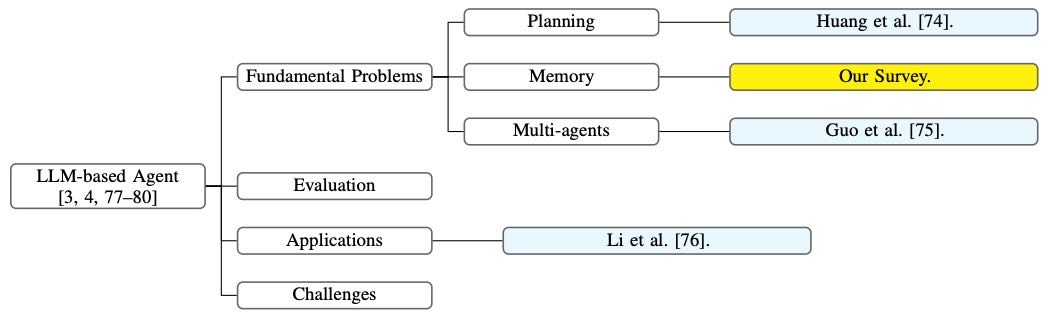 在本综述中,作者对基于大语言模型(LLM)的智能体中的记忆机制进行了系统性的回顾。重点围绕三个核心问题展开:“什么是记忆模块”、“为什么需要记忆模块” 以及 “如何设计和评估记忆模块”。这三个问题构成了全文的主线,具有较强的指导性与理论深度。
