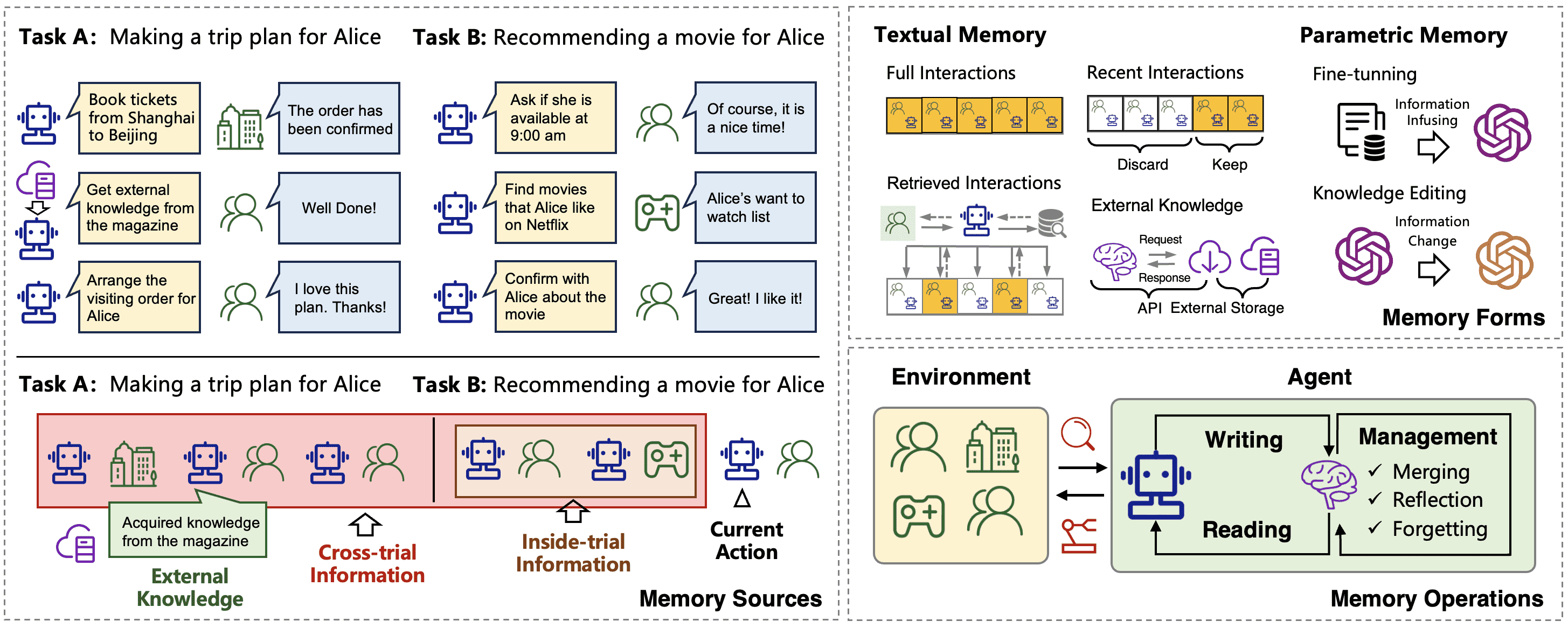 尽管已有大量研究围绕记忆模块展开,如信息来源、存储形式与操作机制等方面,但目前仍缺乏一个系统性的综述,从整体视角对记忆模块进行分析。为此,本文旨在系统回顾相关研究,提出清晰的分类和设计与评估原则,具体围绕以下三个核心问题展开:
