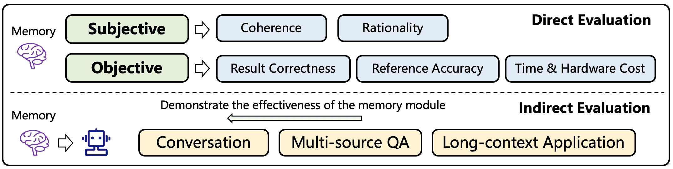 本节讨论了如何评估基于大语言模型(LLM)的智能体中的记忆模块。记忆模块的有效性评估是一个开放问题,已有研究提出了多种评估策略,通常分为两大类:直接评估和间接评估。