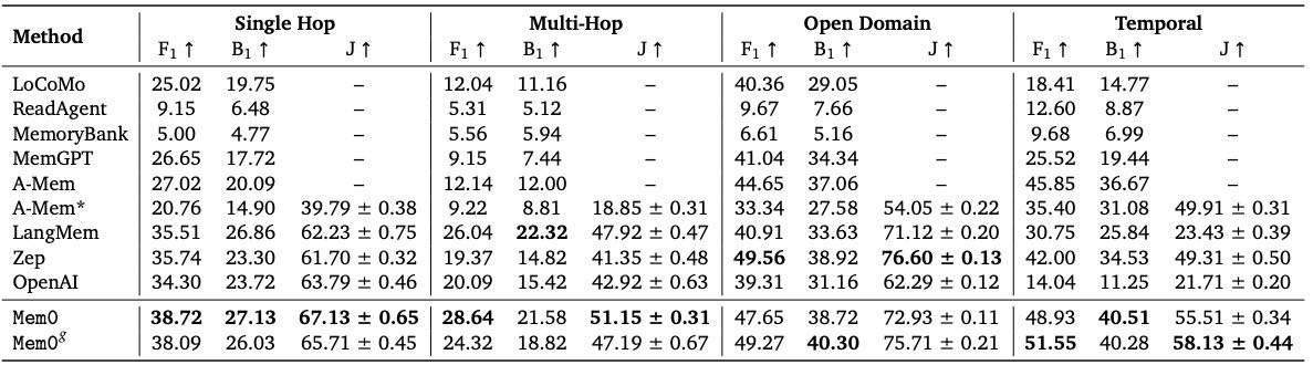 在LOCOMO基准上,Mem0在多种问题类型中优于现有记忆系统(包括记忆增强架构、RAG方法及开源和闭源方案)。