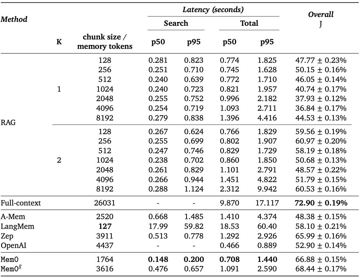 Mem0响应时间比全上下文方法低91%,在推理能力与部署效率之间取得平衡。