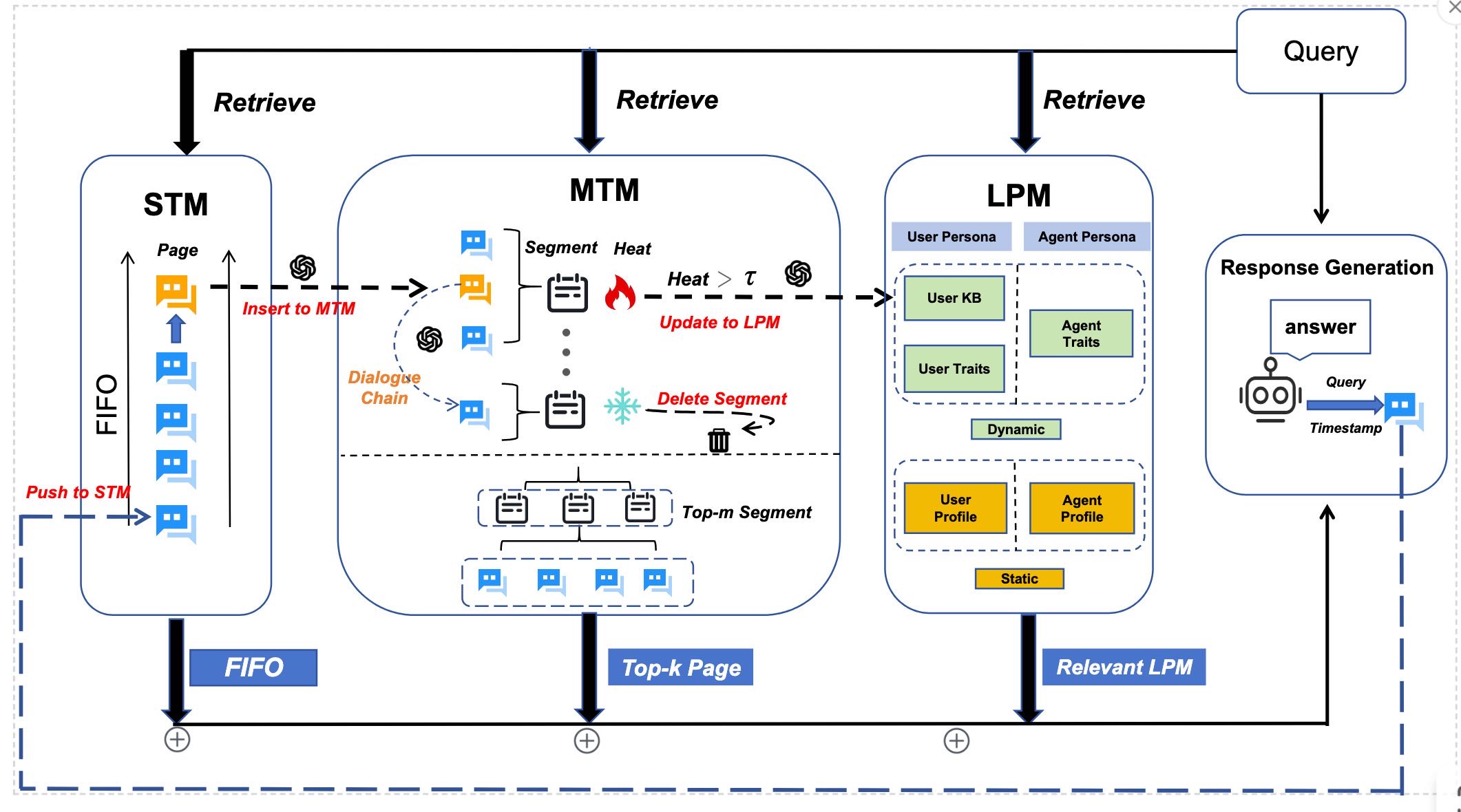 STM 到 MTM 更新: STM 中的对话页以固定长度的队列形式存储,采用“先进先出” (FIFO) 策略进行迁移。当 STM 队列达到最大容量时,最老的对话页根据 FIFO 原则传输到 MTM。