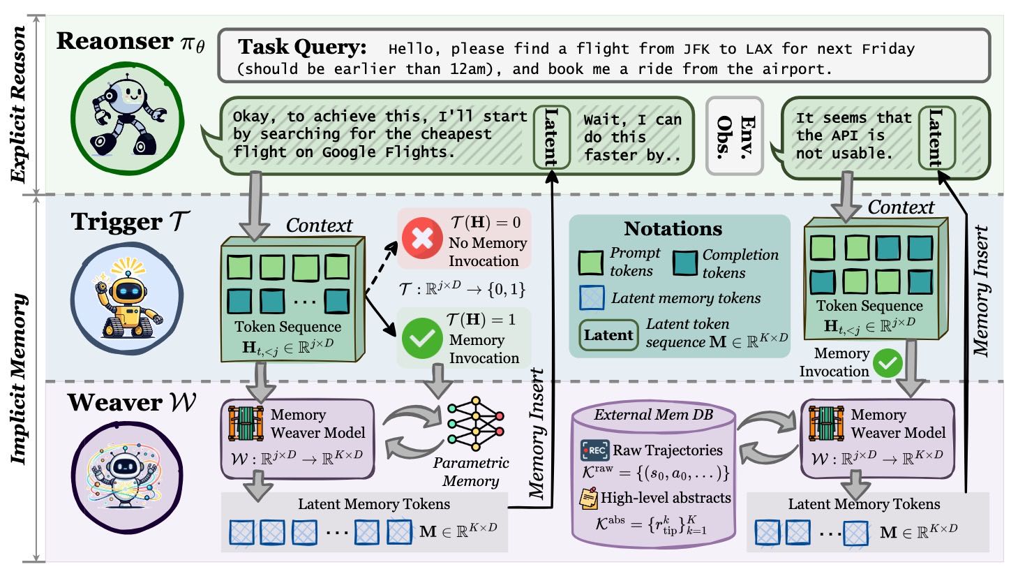 ⚙️ 该框架包含一个经RL训练的memory trigger,用于智能地判断何时触发记忆调用,以及一个memory weaver,负责生成machine-native的latent token sequence以丰富agent的实时推理状态。
